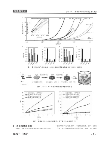 综述与专论 张伟 等·二维纳米催化剂的研究进展与展望 图 5 用于催化氧气进化反应(OER)增强的层状双氢氧化物(LDH)纳米片 图 6 CoCo-LDH 2D 纳米网格用于增强氧气进化 图 7 超薄的 2D Zn-MOF 纳米片,用于将 CO 2 光还原为 CO 3 未来展望和挑战 维纳米材料的进展提供一个整体的视角。首先,我们 现在,我们对近期在光催化和电催化应用中的二 介绍了不同结构和合成方法的范围。然后,我们重点 2024 第 50 卷 ·7· 年
